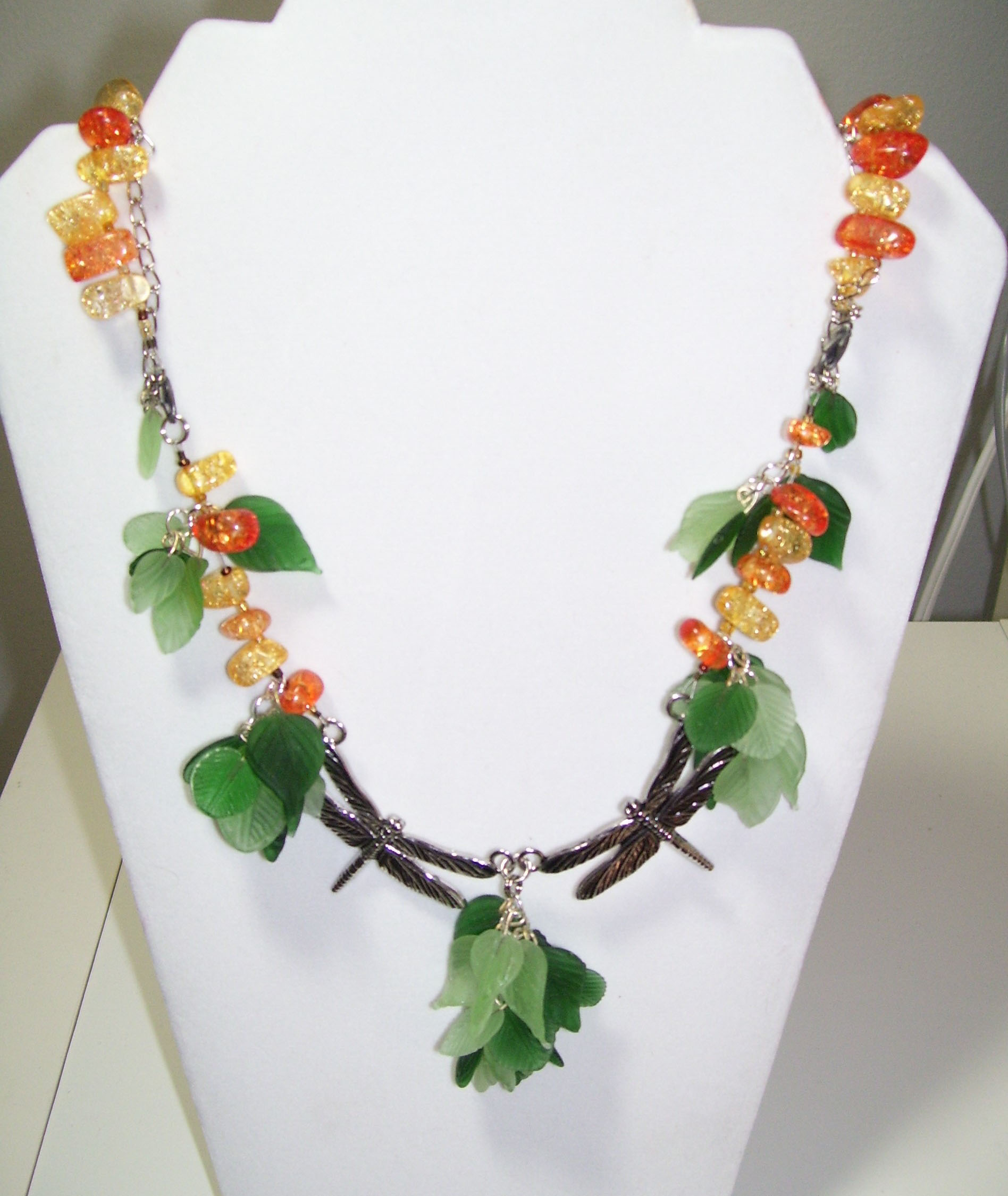 Silver Dragonfly, leaf clusters, orange nuggets necklace $25.00