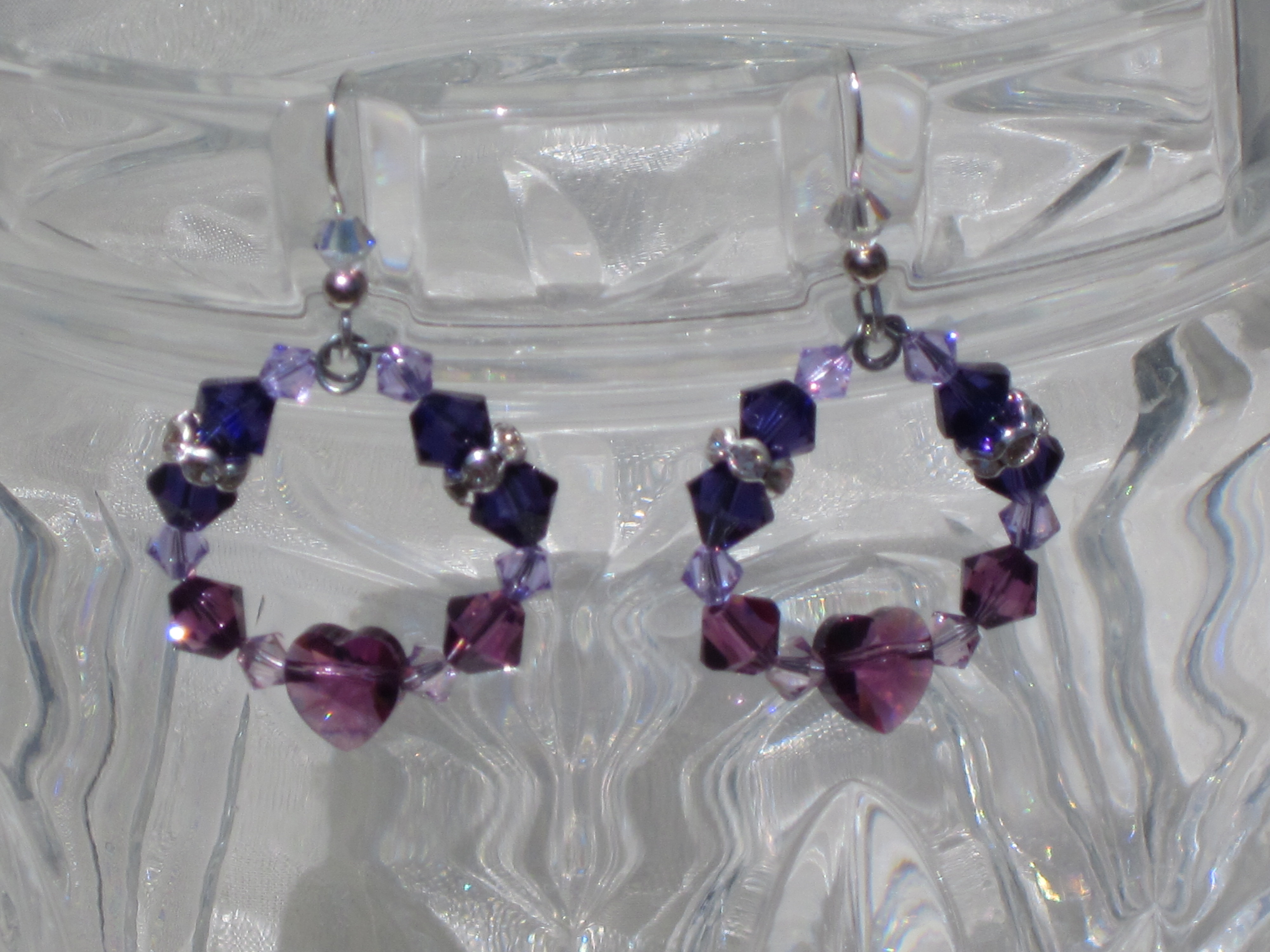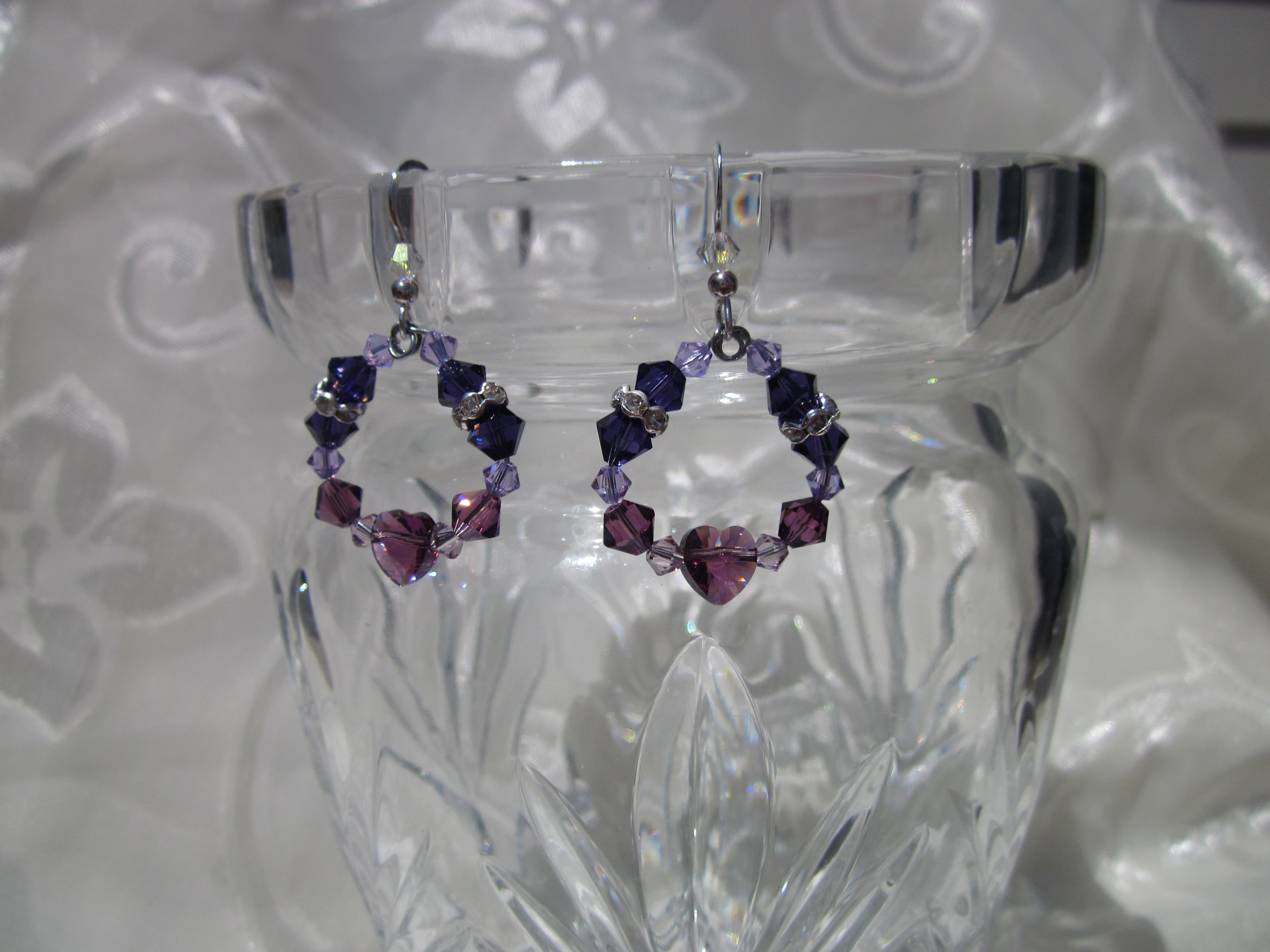 One thought on “Swarovski Crystal Earrings, Shades of Purple, Heart Hoops”