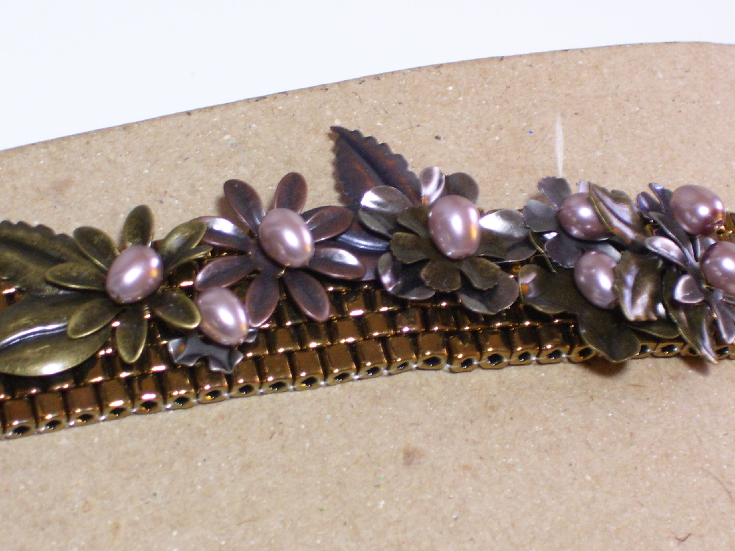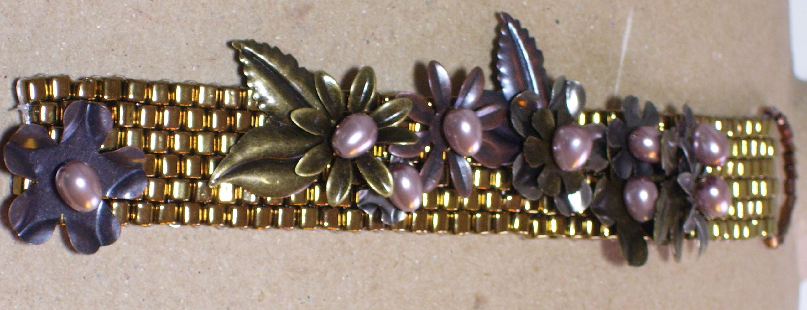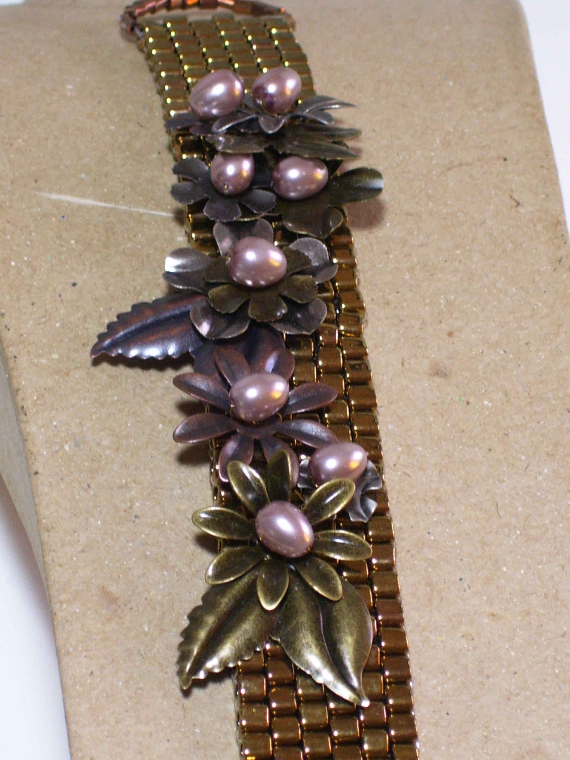I found these brilliantly shiny bronze cube beads at a bead show, and I love them! They make this bracelet absolutely fabulous, and a wonderful background for the flower embellishments. The antique copper, bronze, and gold metal flowers with pearl centers add a unique touch to this woven bracelet. This unique bracelet mixes traditional bead weaving with the industrial grunge style. A wonderful combination! This would make a great gift for someone who appreciates unusual jewelry!