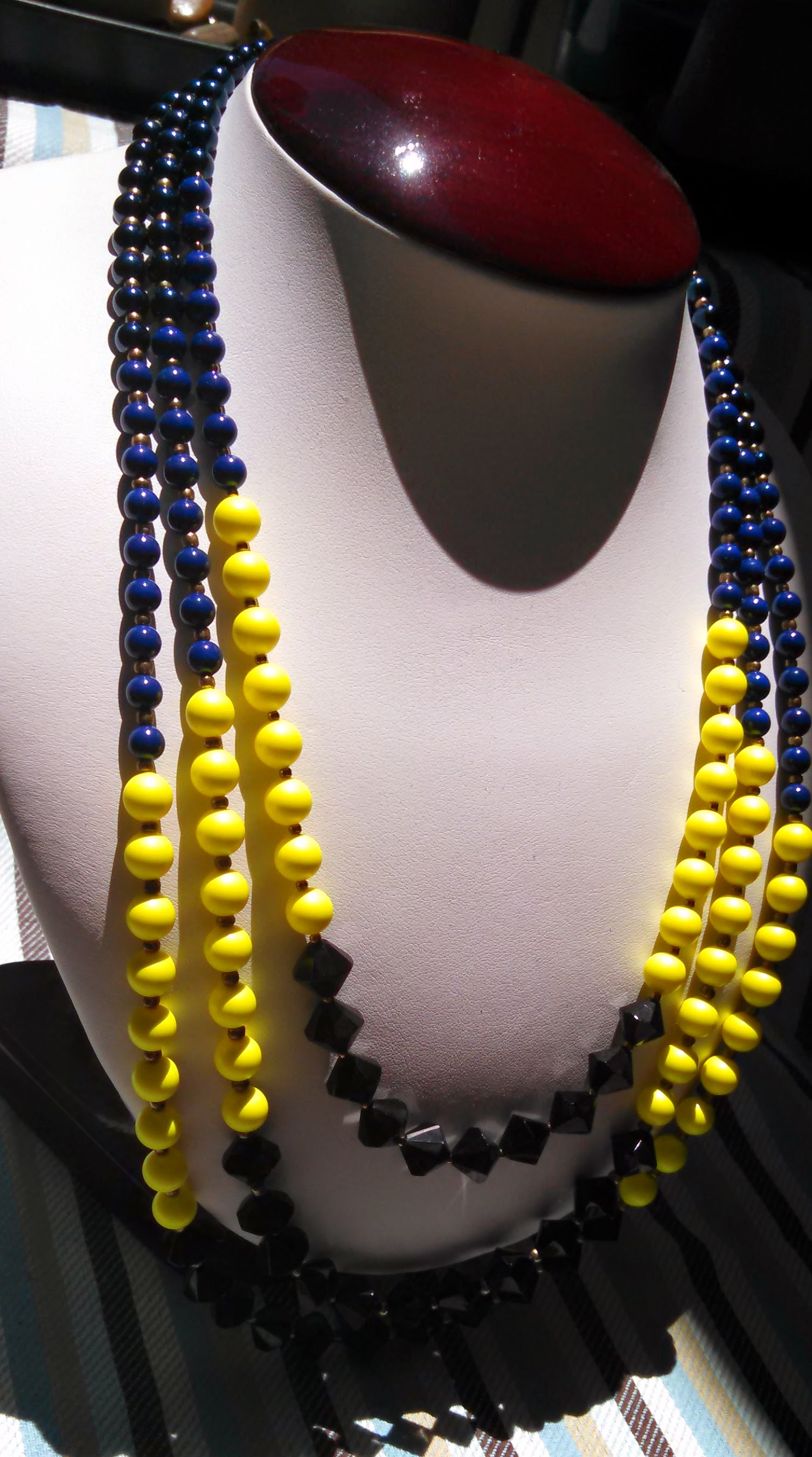 I am constantly finding interesting ideas in magazines, online, and pretty much everywhere! This time I saw a cute necklace in Redbook, and I thought, “I could totally make that necklace!” It seemed simple enough: 3 strands in 3 colors of beads (black, neon yellow, and blue), all of them bicone shaped. It is also one of the few necklaces that I knew I would be making for me to wear. Necklace + T-shirt= easy and fun outfit for summer. The project started off well, I already had the black beads necessary to make the necklace, all I needed were the neon yellow and just (the perfect shade) of blue beads. How hard could that be? Well I should have known better–I am always saying that to myself, and always finding out that yes, there is a problem–or challenge, to completing seemingly simple projects. In this case it was a combination of finding a) the right colors, b) the right sizes, and c) the right shape of beads. I did eventually prevail by making some concessions: I wouldn’t be able to use all bicone shaped beads and the perfect shade of blue I was searching for doesn’t exist. Except of course in the magazine necklace! I was, however, delightfully surprised to find exactly the right shade of yellow–I had thought that would be impossible. Swarovski makes wonderful “pearl” beads and I used these for both the yellow and the blue sections of the necklace. I was able to find them thanks to the magic of online shopping. My favorite online bead store, www.firemountaingems.com carries the best selection of Swarovski items at a reasonable price too! In the end I am very pleased with the result, and I can’t wait to wear my new necklace out for some summer fun.