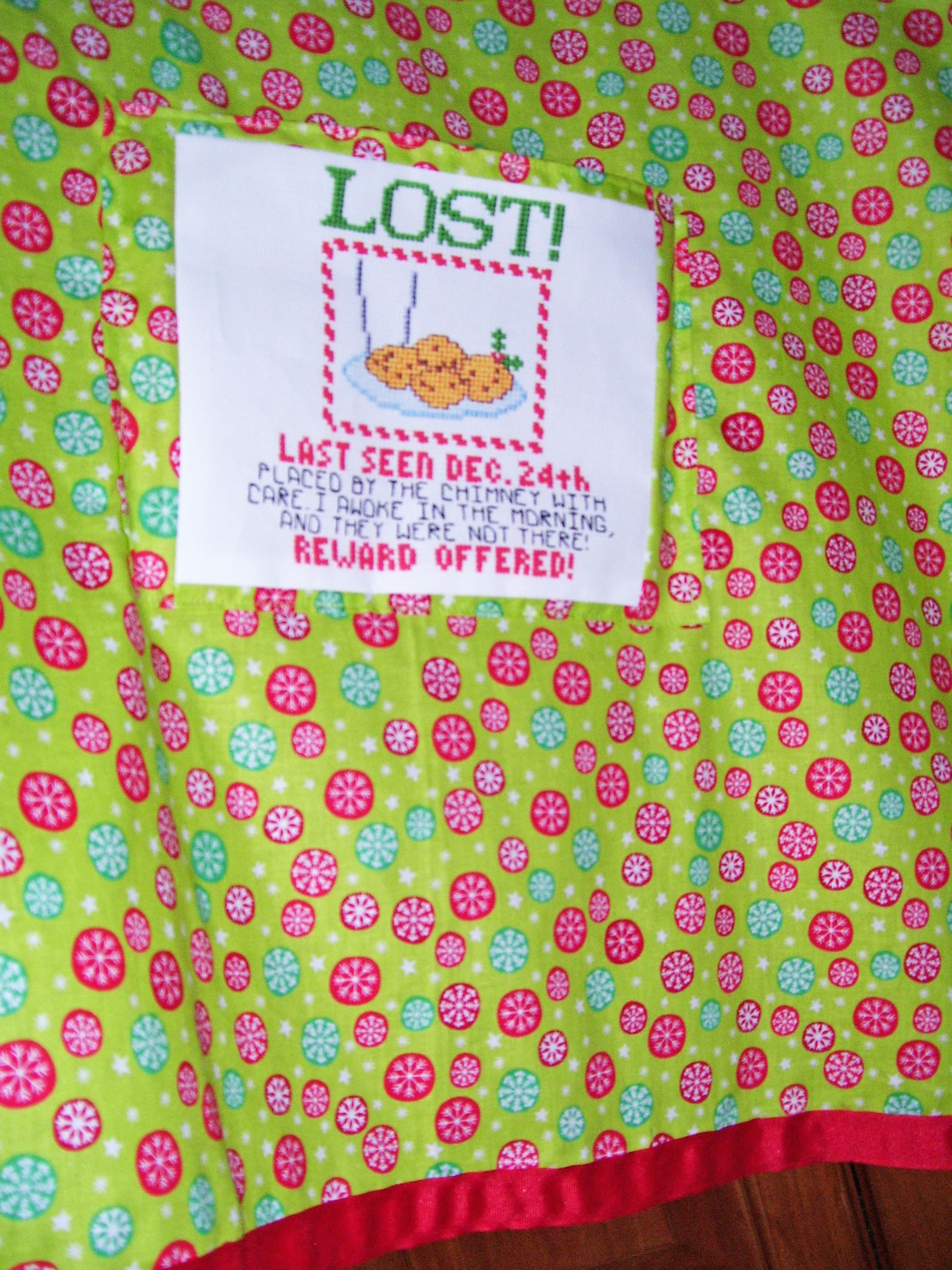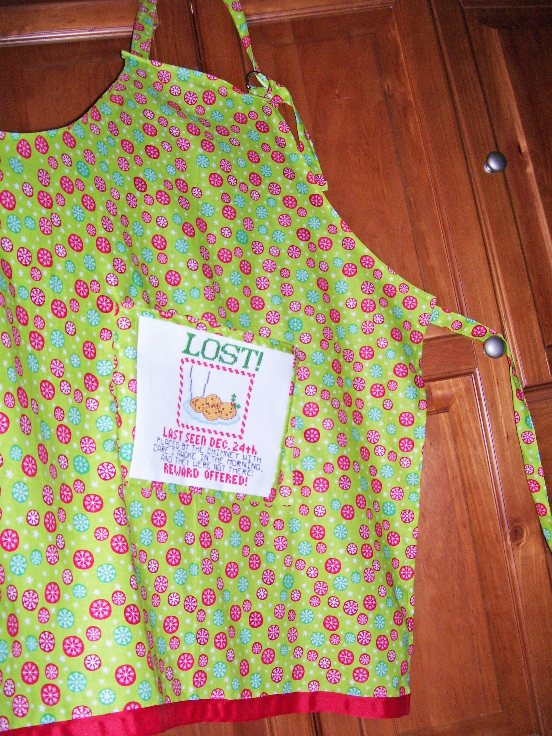 Apron has cross-stitched design of a plate of cookies and is bordered with Christmas snowflake fabric in red and green. Adjustable neck band for length adjustments, one size fits all. Also available, the matching oven mitt and pot holder set. This set will make a great gift for your favorite cook, or for yourself!