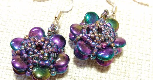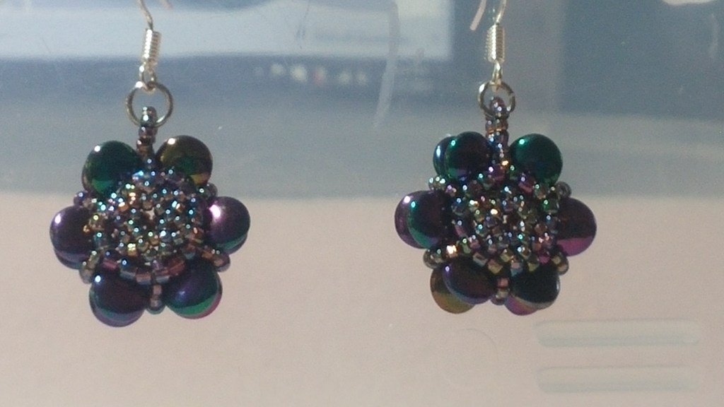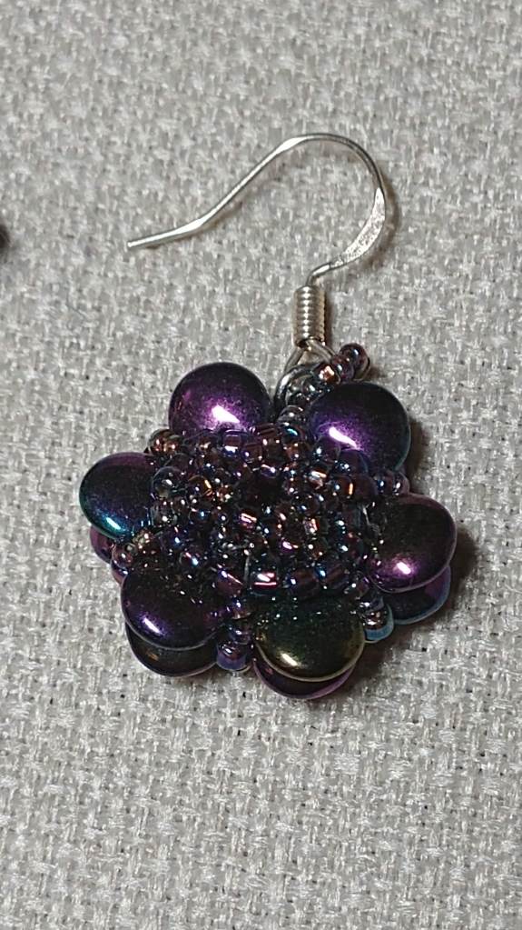 These earrings feature a handwoven floral design created with layers of iridescent beads that shift between deep blues, greens, and hints of purple as they catch the light. The combination of rounded beads and finely stitched centers gives each earring rich texture and dimension while remaining lightweight and comfortable to wear.
