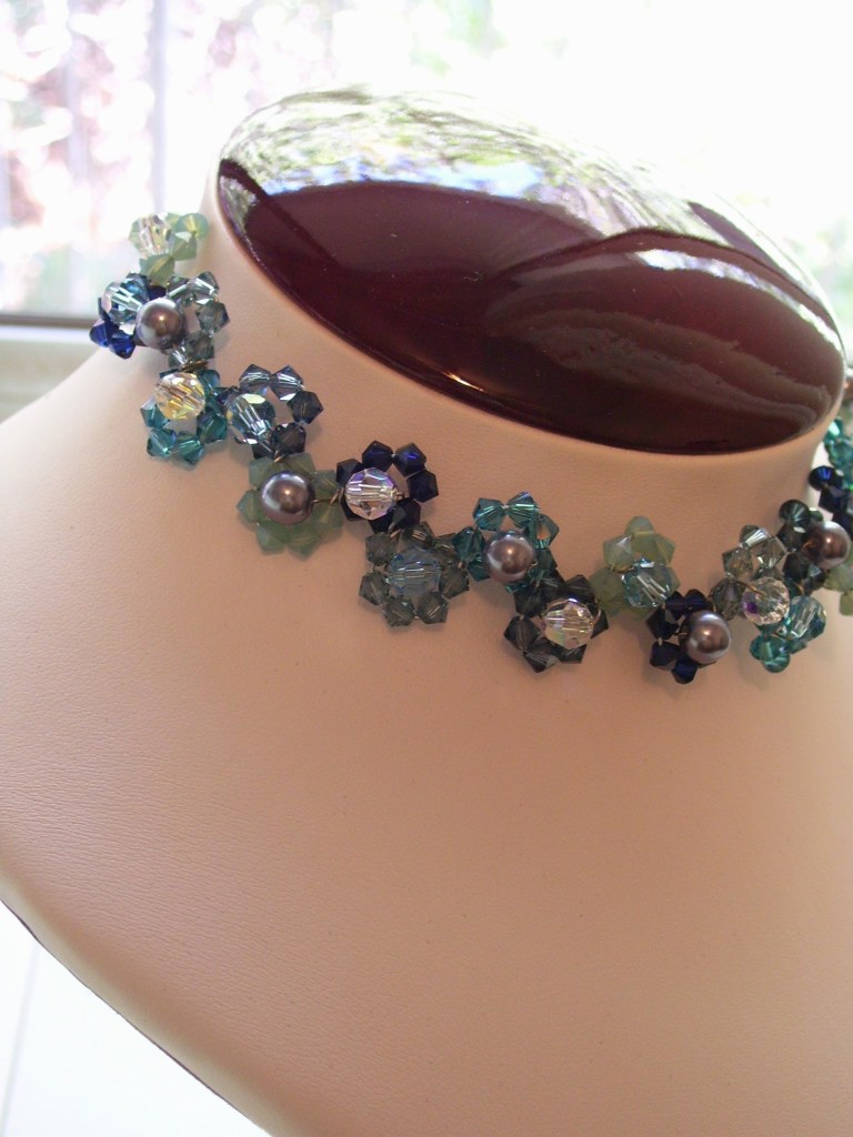 This necklace is handcrafted using intricate clusters of faceted crystal and glass beads, arranged into small floral-inspired groupings that wrap gracefully around the neckline. The color palette blends ocean blues, soft aquas, and subtle silvery grays, creating depth, movement, and luminous sparkle from every angle.